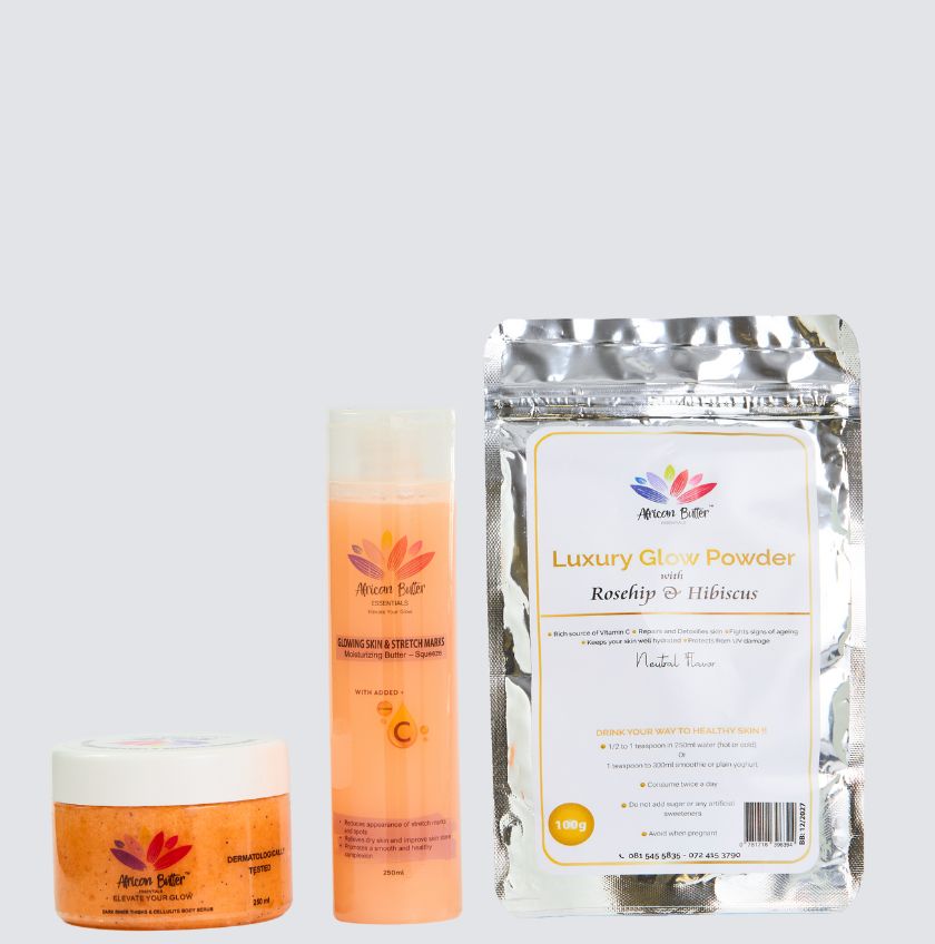 ✔ Glowing & Stretch Mark Moisturizing Butter – A rich body butter that hydrates, smooths, and helps fade stretch marks over time.